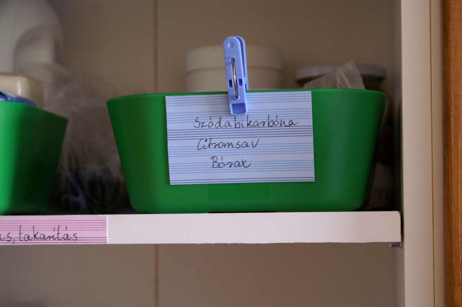 | Mintás papírokra felírtam, hogy az adott polcokon mi található, majd kétoldalú ragasztóval rögzítettem. No és ha még kosár is volt, akkor azokra külön is a beltartalmát. |