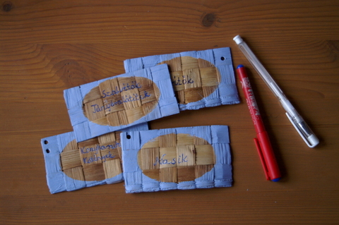 4. Mindegyiket visszatettem a helyére, hogy aztán bejelöljem a csíkokat. Csak az egyik felén, kb. 1cm hosszan húztam meg a vonalat, majd a falról levéve vonalzó segítségével pontos méretek vétele után folytattam. Mindegyikre ráírtam halványan, hogy melyik színnel kell majd festeni: